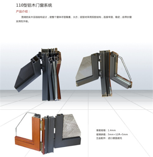 110型铝木二合一门窗系统产品特点:1、采用铝合金和实木结构,温馨时尚,大气坚固。2、选用德国HOPPE(好博)及ROTO(诺托)进口五金配件,可承载较大面积窗扇,手感舒适,操作灵活。3、复合式金刚网设计,满足美感通风的同时也实现了防蚊、防盗的个性效果。4、多重密封设计,确保气密性、水密性、隔音性及隔热性,环保节能性更强。